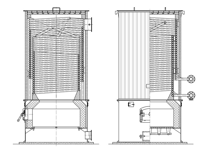 爐體內(nèi)、外螺旋盤(pán)管采用多頭、小管徑鋼管制成,盤(pán)管的熱膨脹性能好、應(yīng)力低,安全可靠。